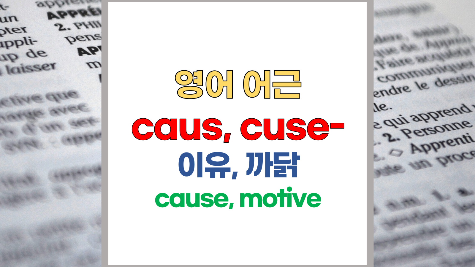 | 영어 어근 caus, cuse는 라틴어(Latin) causa에서 유래했습니다. 이유, cause, motive라는 기본적인 의미를 갖고 있습니다. |