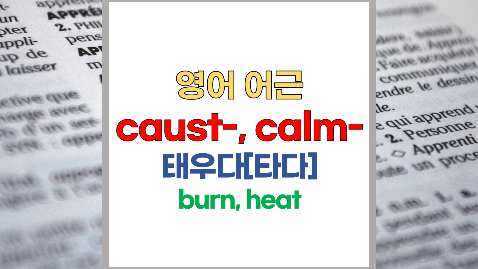 | 영어 어근 caust-, calm-은 그리스어(Greek) kaiein, kaustos, kautos, kaustikos), kausis, kauma에서 유래했습니다. 태우다[타다], 열, burn, heat (of the day)라는 기본적인 의미를 갖고 있습니다. |