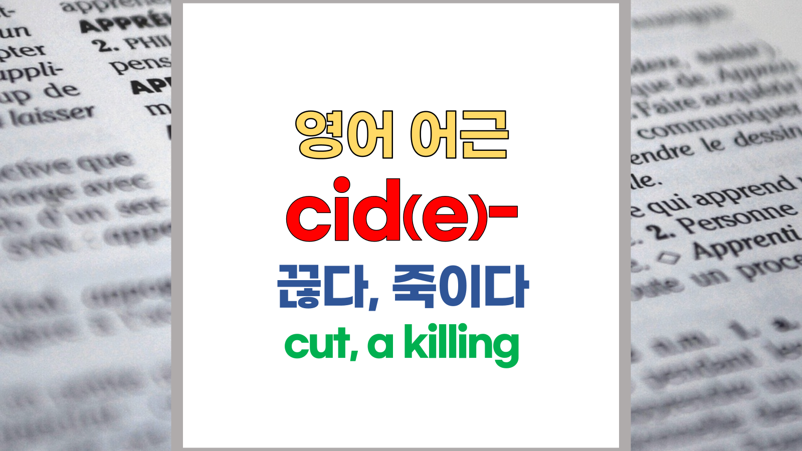 | 영어 어근 cide는 라틴어(Latin) caedere, caementa, cidere, caesus, cidium에서 유래했습니다. 끊다, 죽이다, 죽임, 살해, 초석, cut, a killing이라는 기본적인 의미를 갖고 있습니다. |