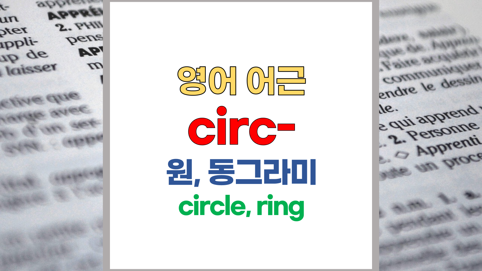 | 영어 어근 circ-는 라틴어(Latin) circulari, circus에서 유래했습니다. 원, circle, ring이라는 기본적인 의미를 갖고 있습니다. |