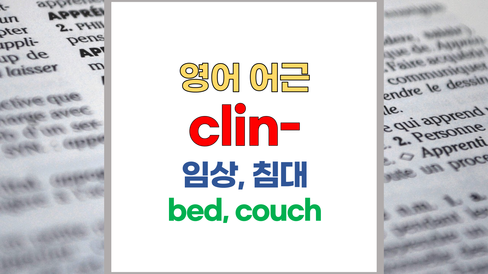 | 영어 어근 clin-은 그리스어(Greek) kline에서 유래했습니다. 임상, 침대, bed, couch라는 기본적인 의미를 갖고 있습니다. |