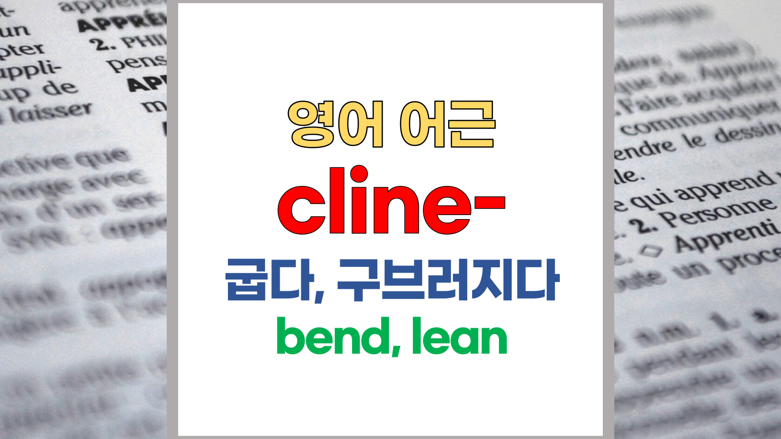 | 영어 어근 cline, clin-은 라틴어(Latin) clinare에서 유래했습니다. 굽다, bend, 구브러지다, 경사면(傾斜面), 경사진, 각, lean, recline이라는 기본적인 의미를 갖고 있습니다. |