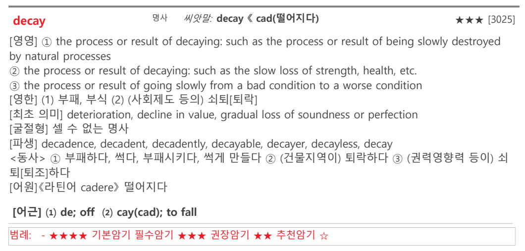 언어는 언제나 역사를 품고 있고, decay라는 단어는 그 자체로 하나의 문명사적 흐름을 드러냅니다. 단어 하나의 퇴락 과정이 오히려 인간 사고의 성숙을 드러낸다는 점에서, 어원 탐구는 단어의 '쇠퇴'가 아닌 **의미의 ‘심화’**라 할 수 있을 것입니다.