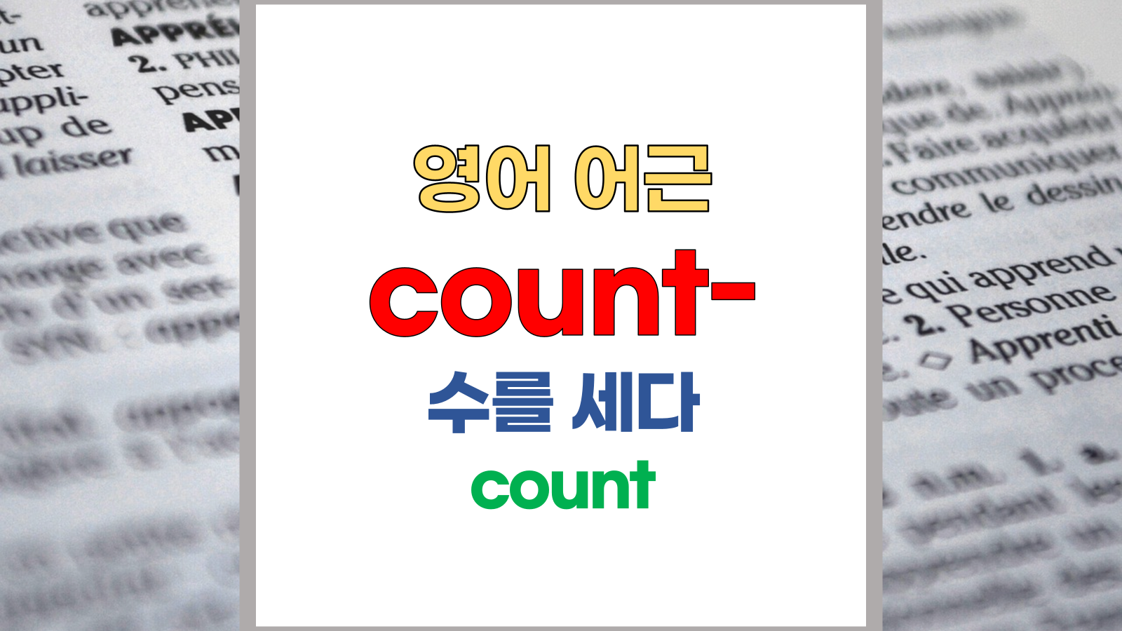 | 영어 어근 count는 라틴어(Latin) computare에서 유래했습니다. 계산, 수를 세다, count라는 기본적인 의미를 갖고 있습니다. |