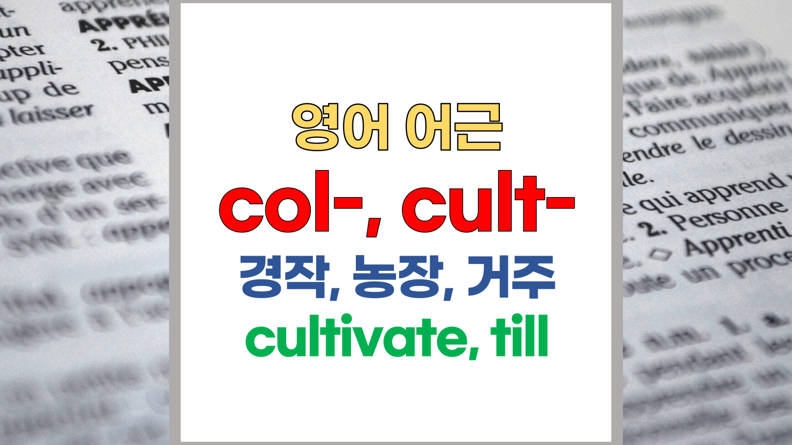 | 영어 어근 col-, cult-는 라틴어(Latin) colere, cultus, colonia, cultivare에서 유래했습니다. 경작, 농장, 거주, 몸을 치장하다, 존중, 사랑, 제사 지내다, 숭배 신앙, 제사, 교화, 개발, 교양, 문화, cultivate, till, inhabit, colony라는 기본적인 의미를 갖고 있습니다. |