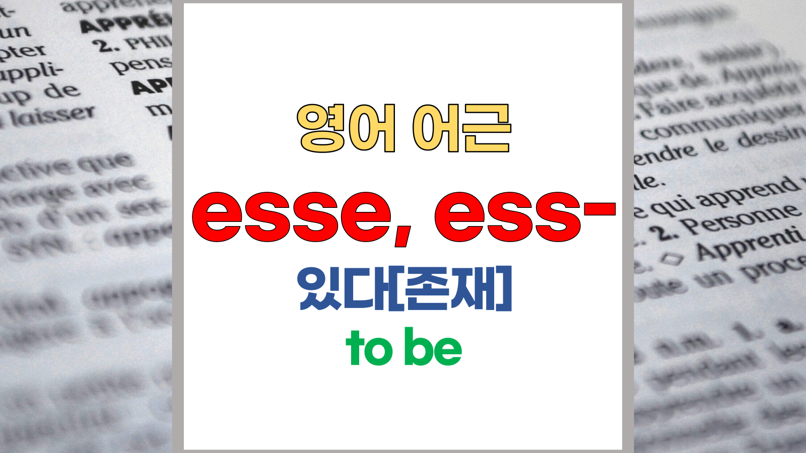 | 영어 어근 esse, ess-는 라틴어(Latin) esse, futurus, futura에서 유래했습니다. 존재, 존재하다, to be라는 기본적인 의미를 갖고 있습니다. |