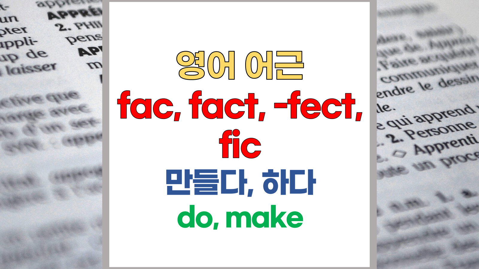 | 영어 어근 fac, fact, -fect, fic는 라틴어(Latin) facere, factus, ficus, facilis에서 유래했습니다. 만들다, 하다, make, do라는 기본적인 의미를 갖고 있습니다. |