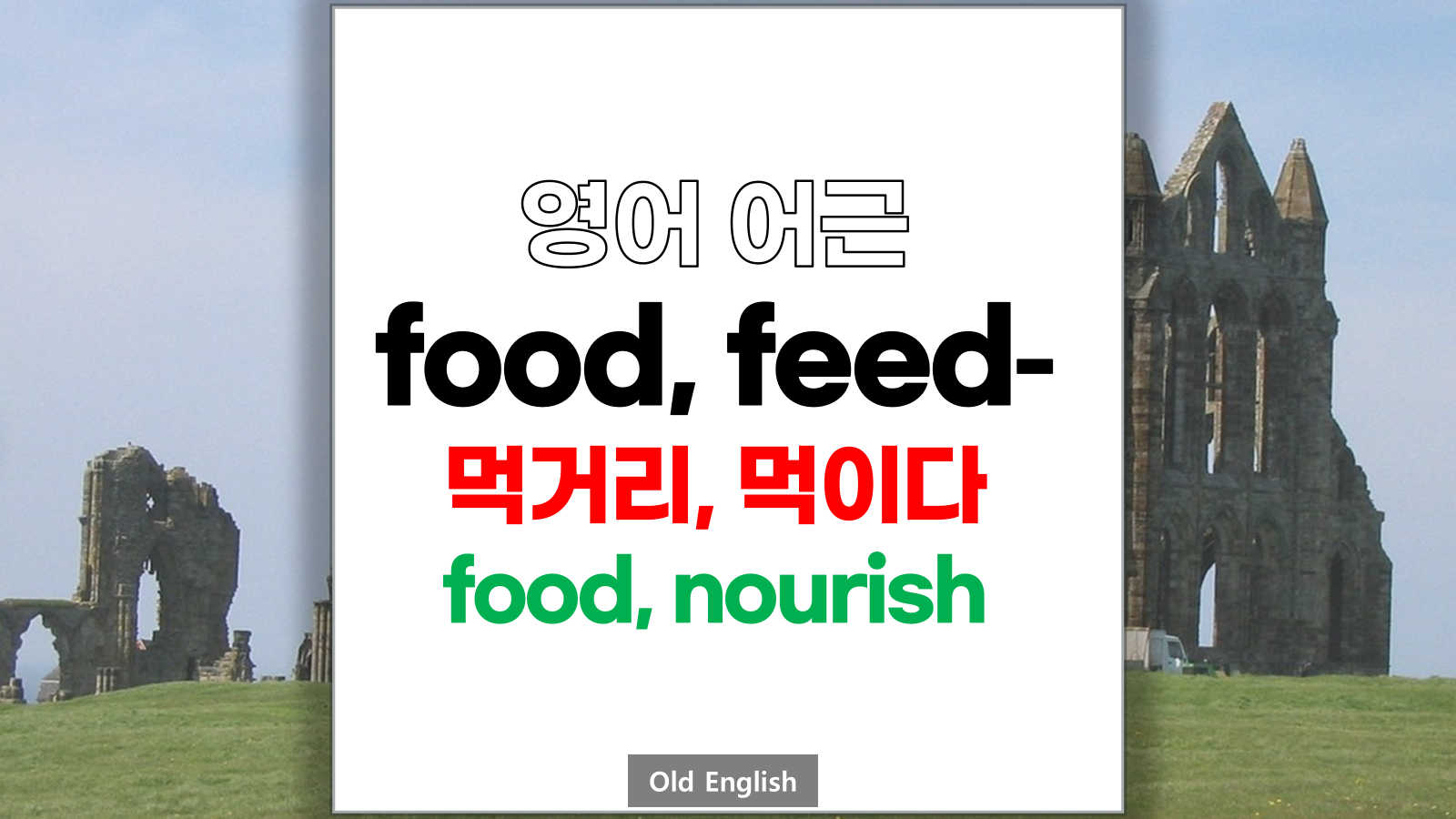 | 영어 어근 food, feed는 고대 영어(Old English) foda, fedan, fostor에서 유래했습니다. 음식, 먹이다, food, nourish라는 기본적인 의미를 갖고 있습니다. |