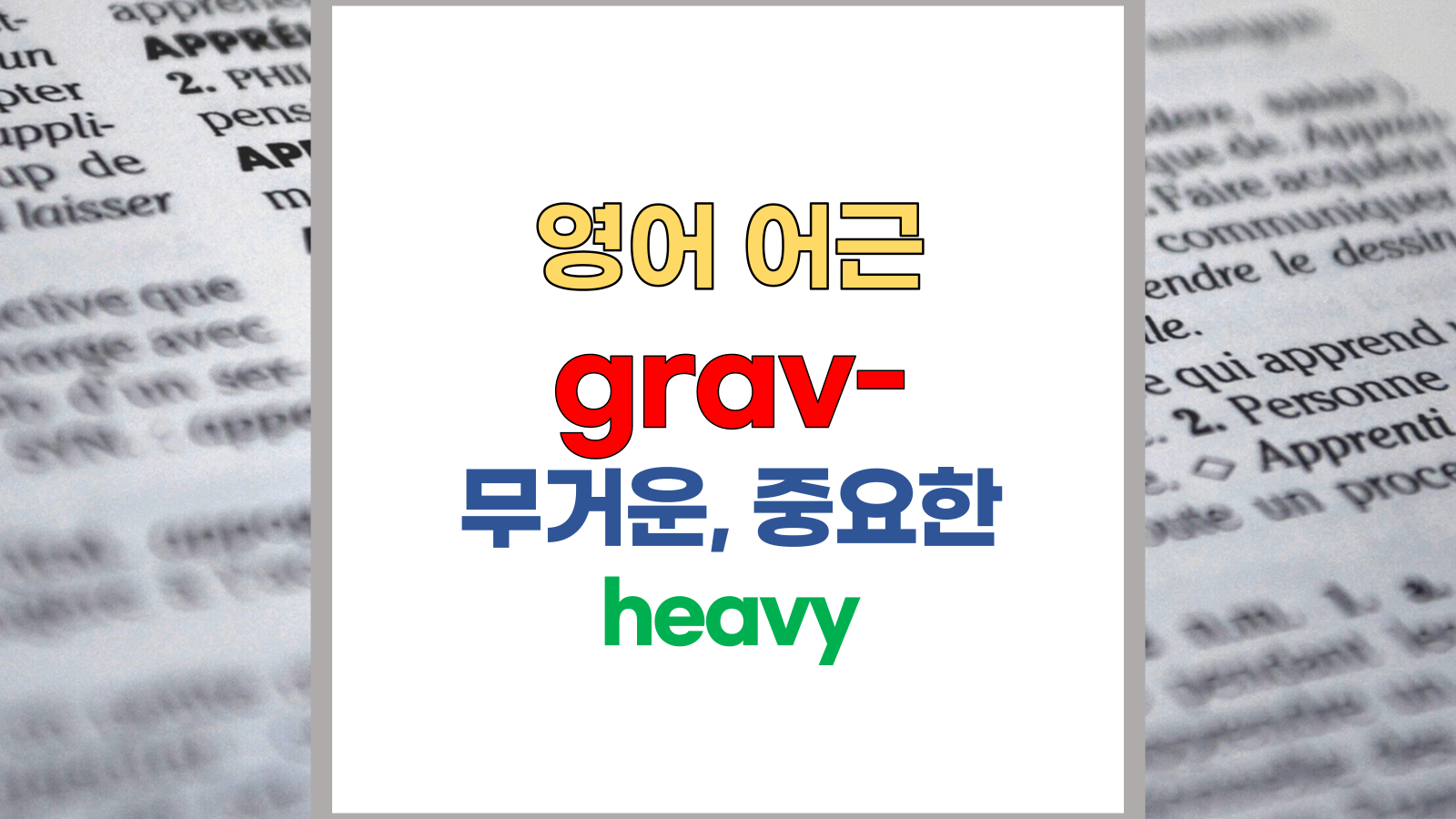 | 영어 어근 grav-는 라틴어(Latin) gravis, gravare에서 유래했습니다. 무거운, 중요한, heavy라는 기본적인 의미를 갖고 있습니다. |