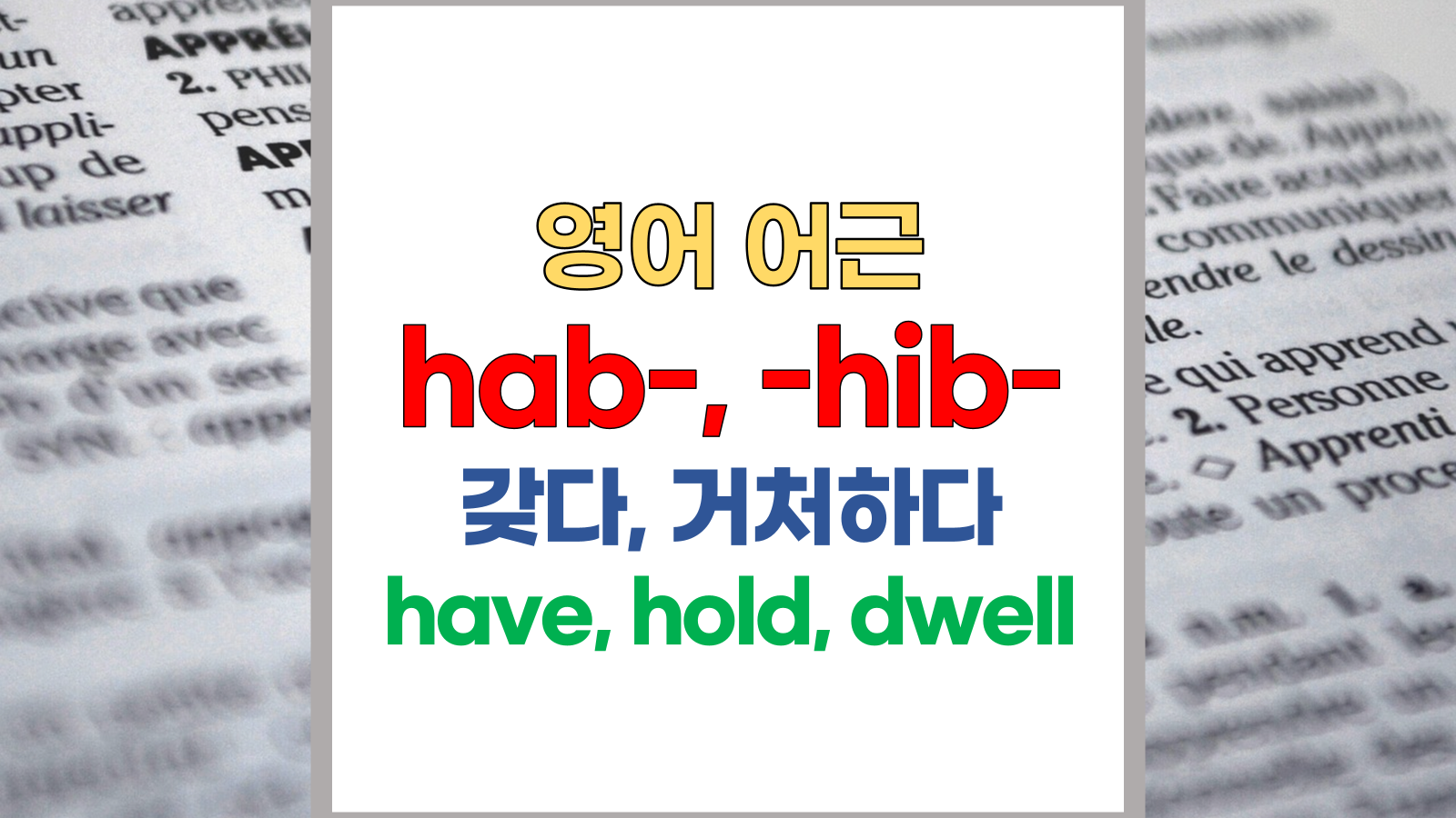 | 영어 어근 hab-, -hib-, habit-, -hibit-는 라틴어(Latin) habere, habitus, habitare에서 유래했습니다. 갖다, 거처하다, hold, have, dwell, able이라는 기본적인 의미를 갖고 있습니다. |