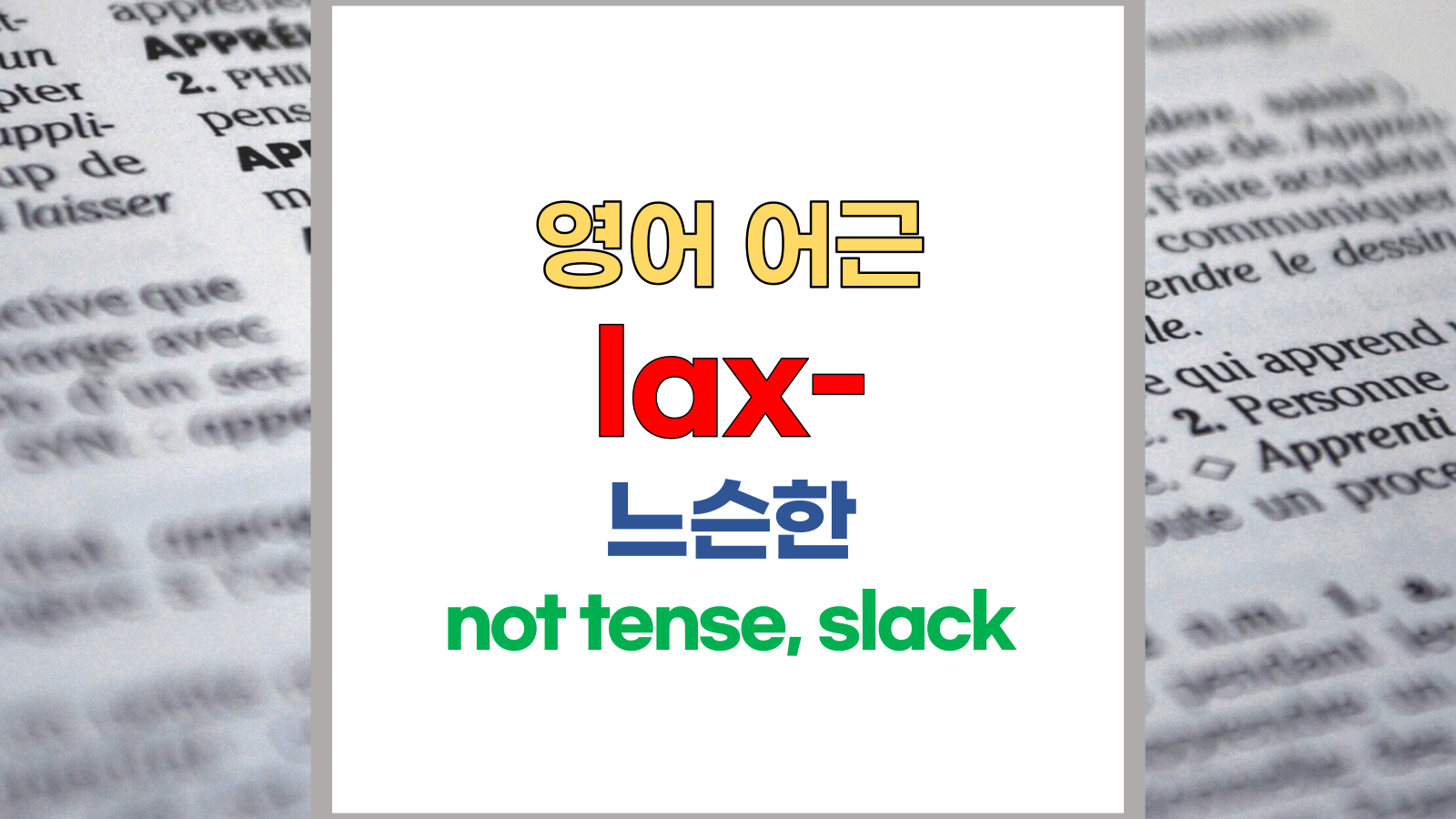 | 영어 어근 lax는 라틴어(Latin) laxus, laxare에서 유래했습니다. 느슨한, not tense, slack라는 기본적인 의미를 갖고 있습니다. |