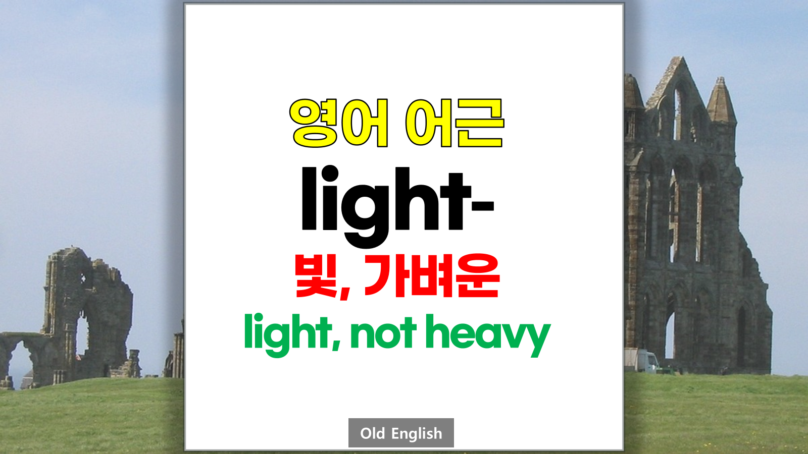 | 영어 어근 light는 고대 영어(Old English) leoht, liht, leht, lihtan, liehtan에서 유래했습니다. 빛, 가벼운, light, luminous, not heavy라는 기본적인 의미를 갖고 있습니다. |