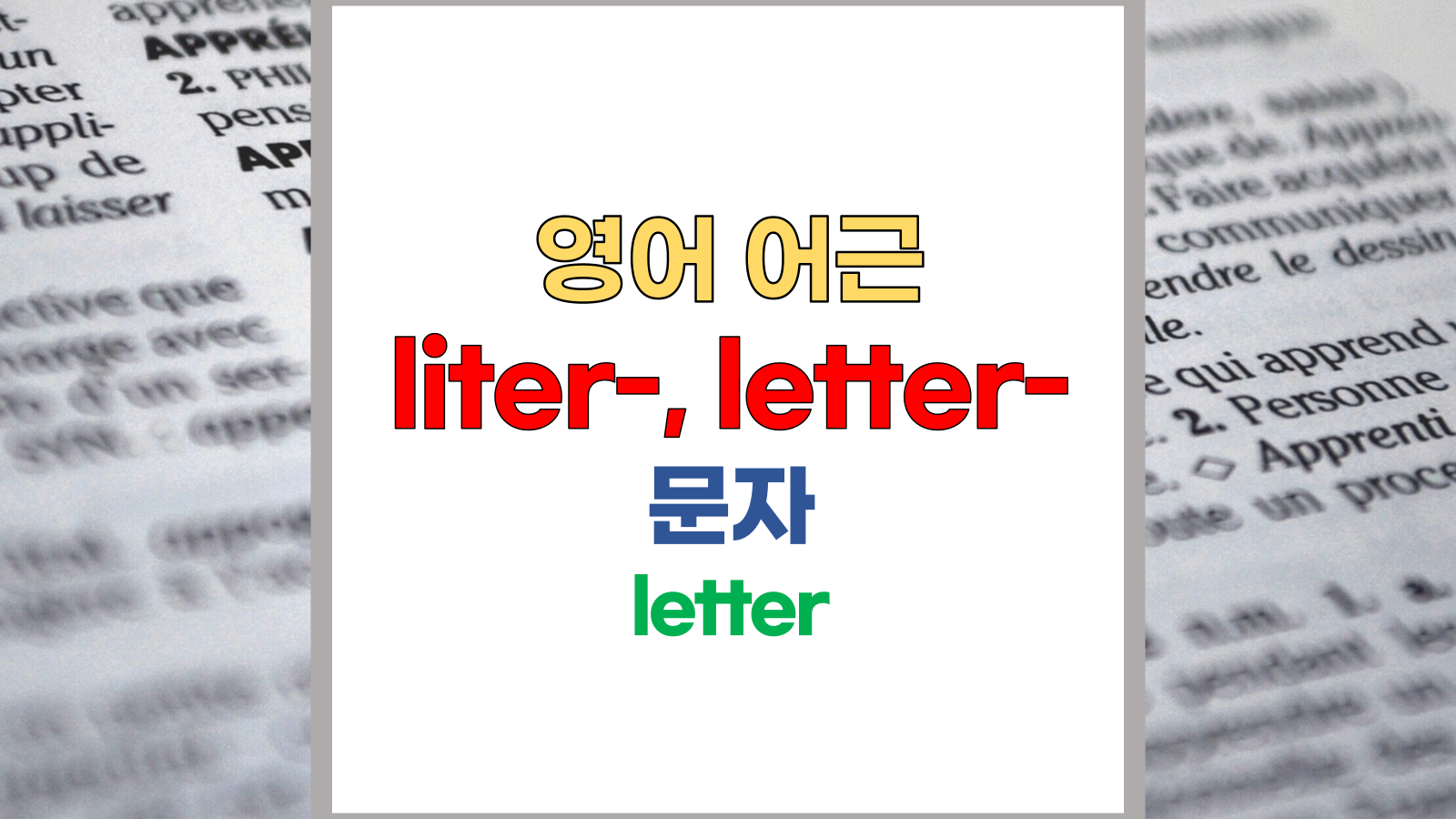 | 영어 어근 liter-, letter-는 라틴어(Latin) littera, litera에서 유래했습니다. 문자, letter라는 기본적인 의미를 갖고 있습니다. |
