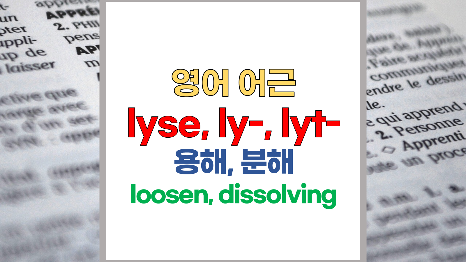 | 영어 어근 lyse, ly-, lysi-, lyt-는 그리스어(Greek) luein, lyein, lysis, lusis, lutos, lutikos에서 유래했습니다. 용해, 분해, loosen, dissolving이라는 기본적인 의미를 갖고 있습니다. |