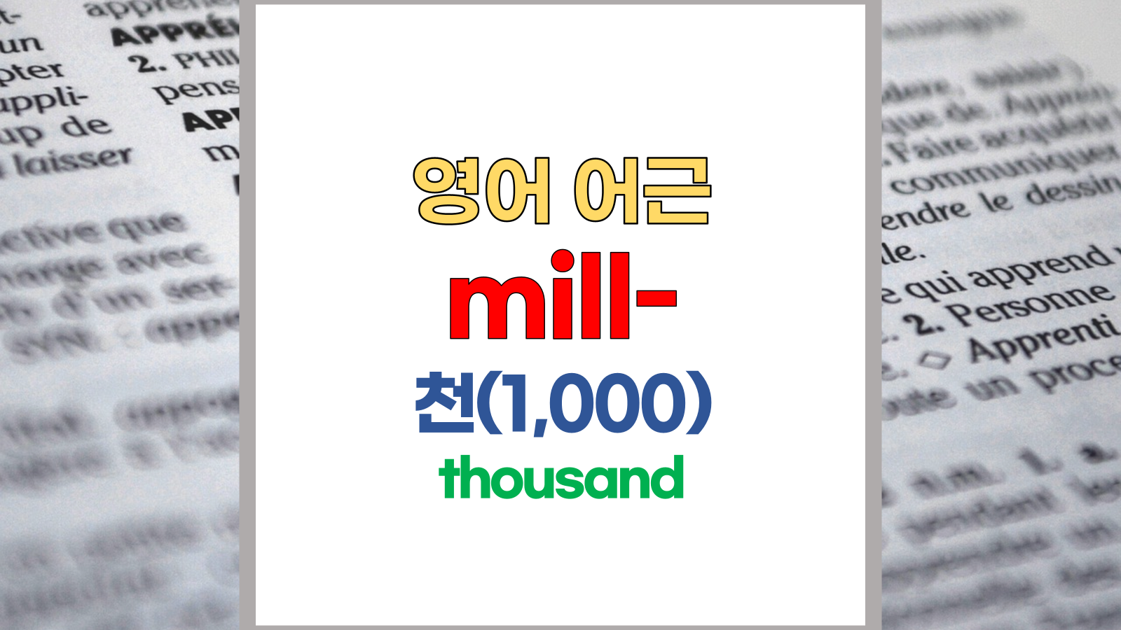 | 영어 어근 mill은 라틴어(Latin) mille에서 유래했습니다. 천, 1000, thousand라는 기본적인 의미를 갖고 있습니다. |