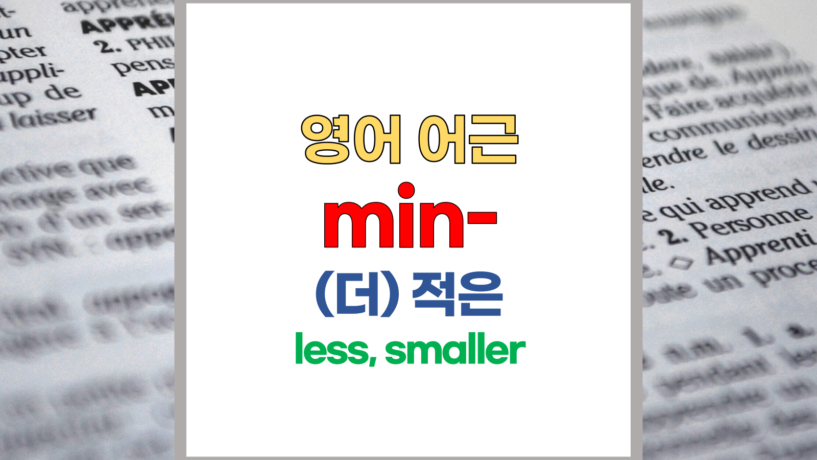 | 영어 어근 minor, min-은 라틴어(Latin) minor, minus, minuere, minimus에서 유래했습니다. 작은, less, smaller, make small라는 기본적인 의미를 갖고 있습니다. |
