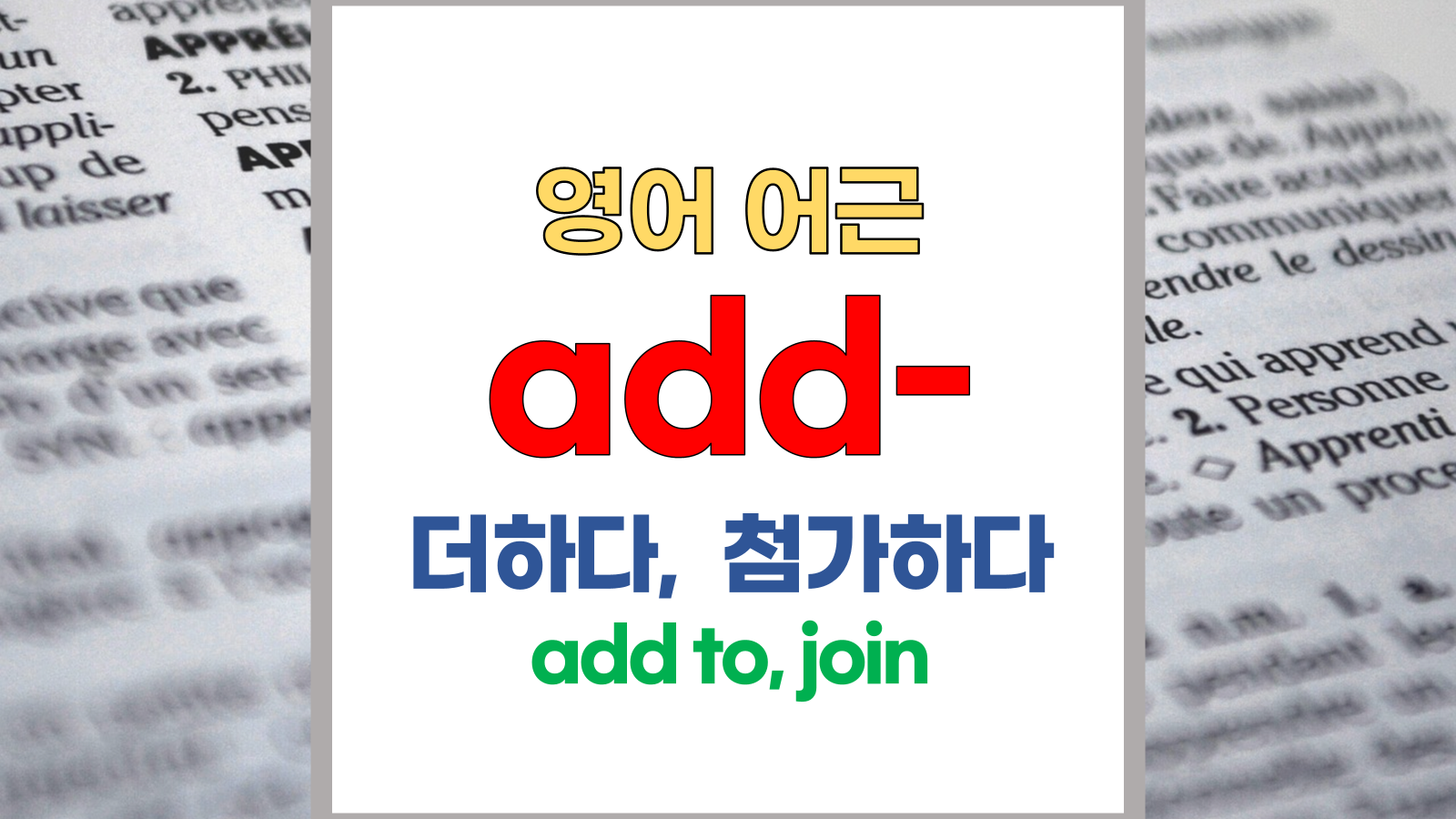 | 영어 어근 add-는 라틴어(Latin) addere, additio, dare, dere에서 유래했습니다. '더하다', '첨가하다', 'add', 'add to', 'join', 'attach'라는 기본적인 의미를 갖고 있습니다. |