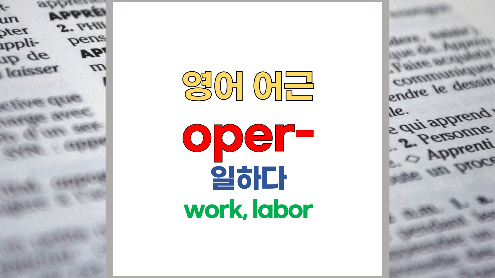 | 영어 어근 oper-, opera-는 라틴어(Latin) opus, operis, opera, operari에서 유래했습니다. 일하다, 노동, 노력, work, labor, exertion이라는 기본적인 의미를 갖고 있습니다. |