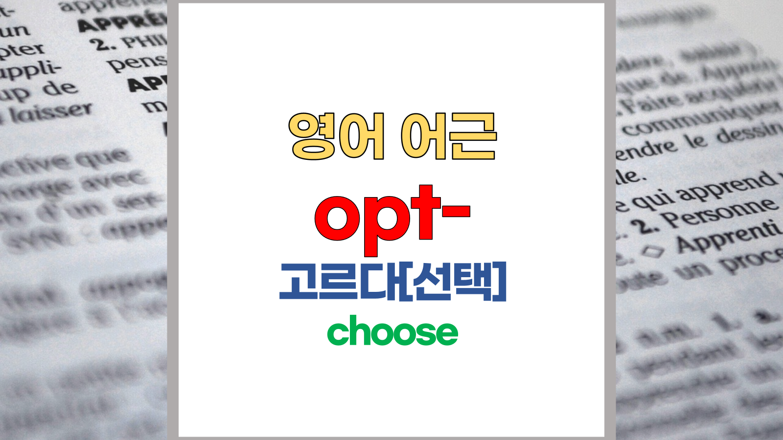 | 영어 어근 opt는 라틴어(Latin) optare에서 유래했습니다. 고르다, 선택, choose라는 기본적인 의미를 갖고 있습니다. |