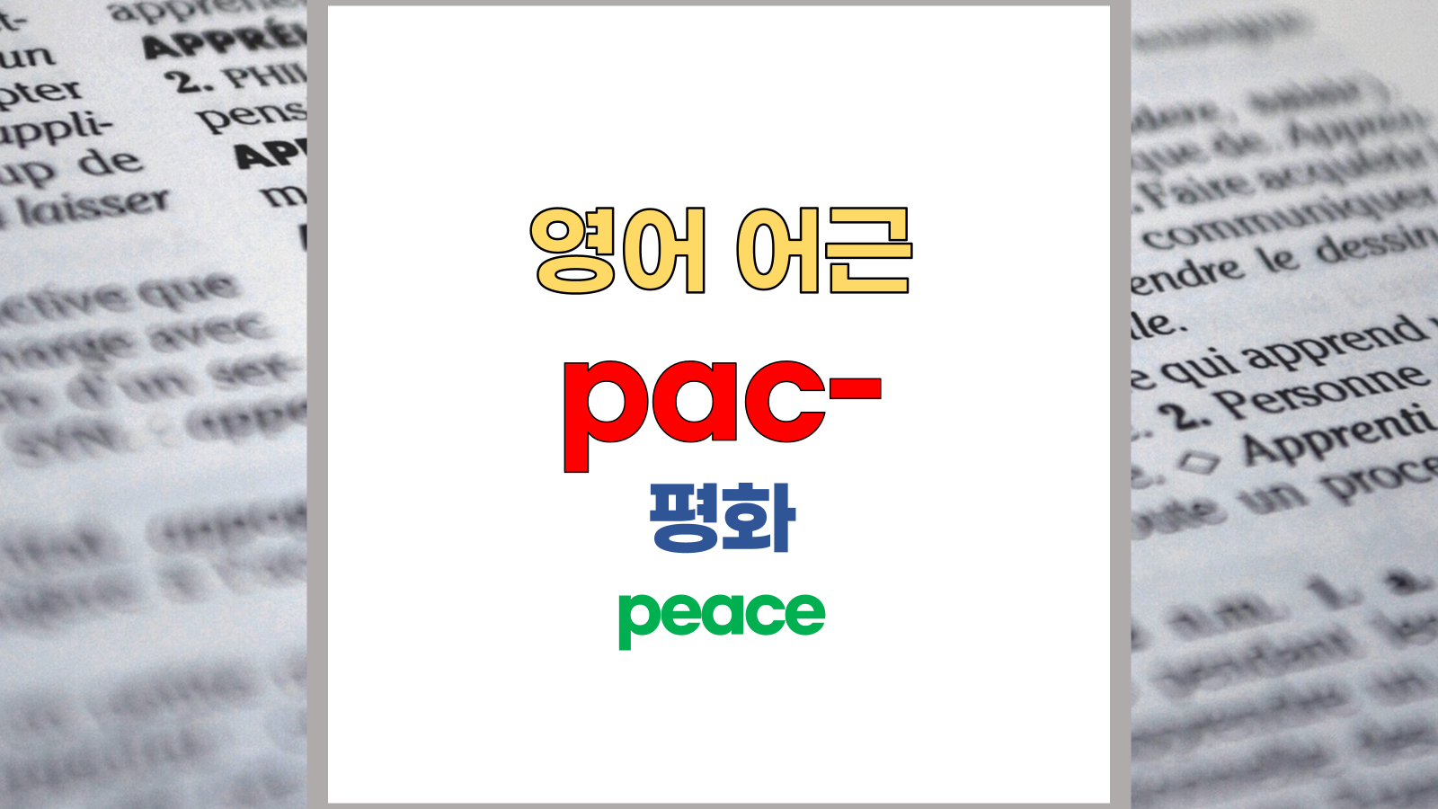 | 영어 어근 pac는 라틴어(Latin) pax, pacis에서 유래했습니다. 평화, peace라는 기본적인 의미를 갖고 있습니다. |