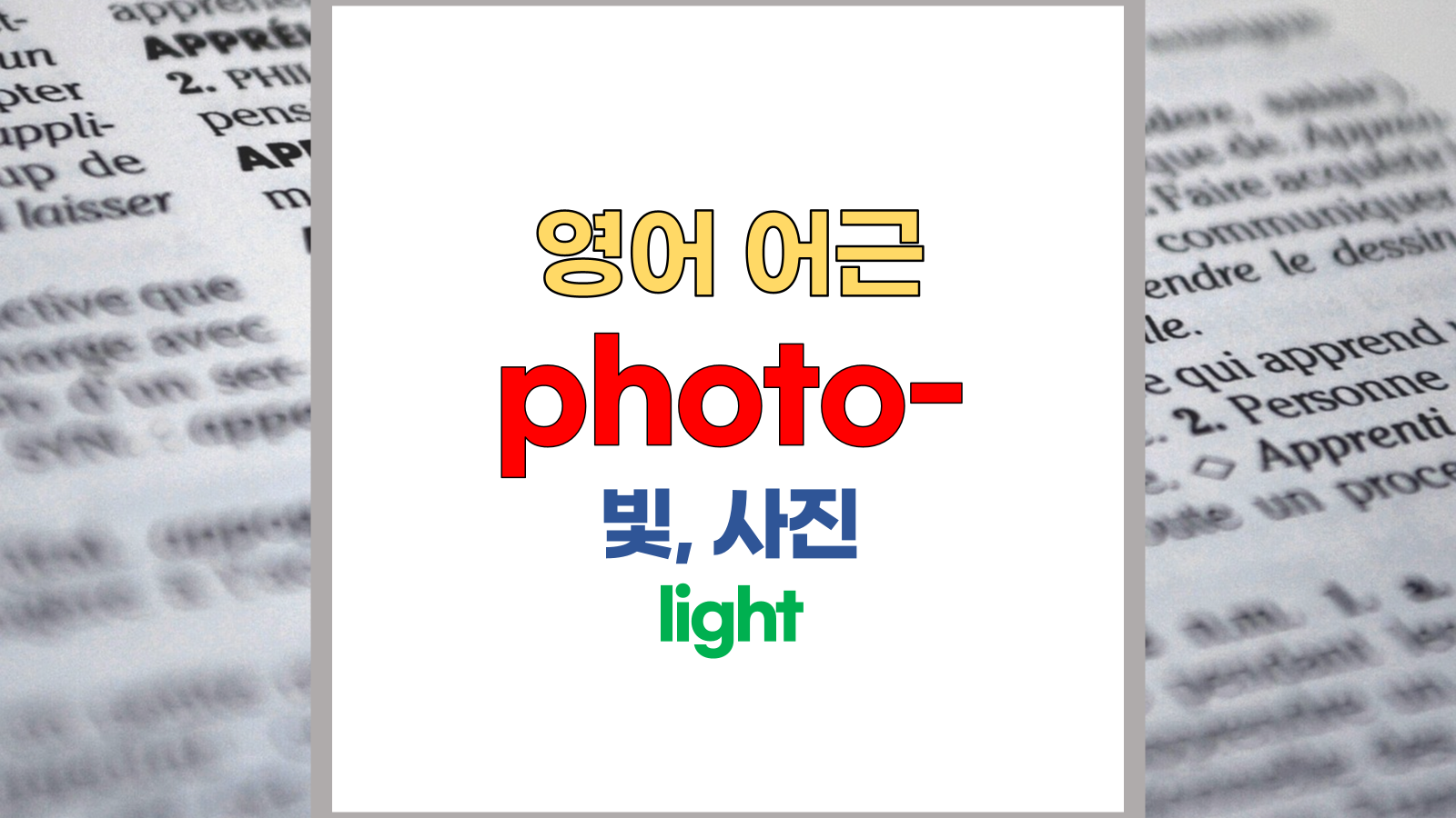 | 영어 어근 photo는 그리스어(Greek) photos, phos, photo-에서 유래했습니다. 빛, 사진, light라는 기본적인 의미를 갖고 있습니다. |