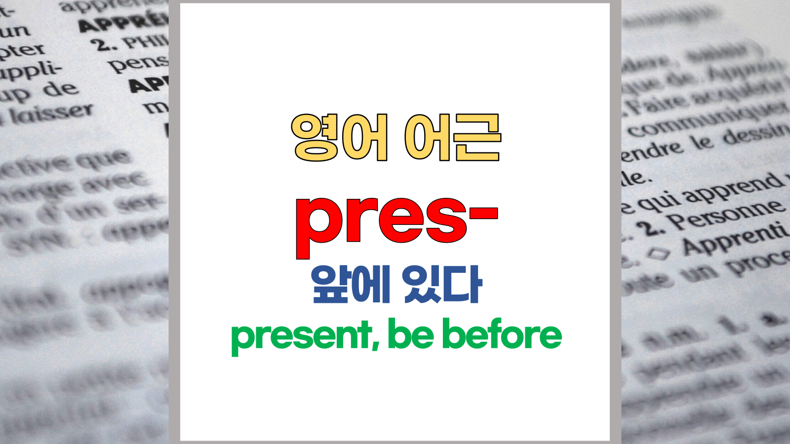 | 영어 어근 pres-, present는 라틴어(Latin) præesse, praesentem, present, praesentare, praesens에서 유래했습니다. 앞에 있다, be before, present라는 기본적인 의미를 갖고 있습니다. |
