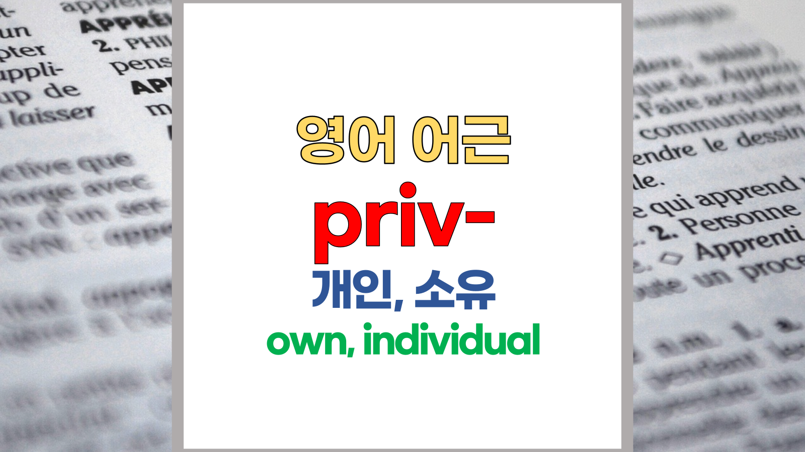 | 영어 어근 priv는 라틴어(Latin) privus, privare, privatus에서 유래했습니다. 개인, 소유, 개인의, own, individual이라는 기본적인 의미를 갖고 있습니다. |