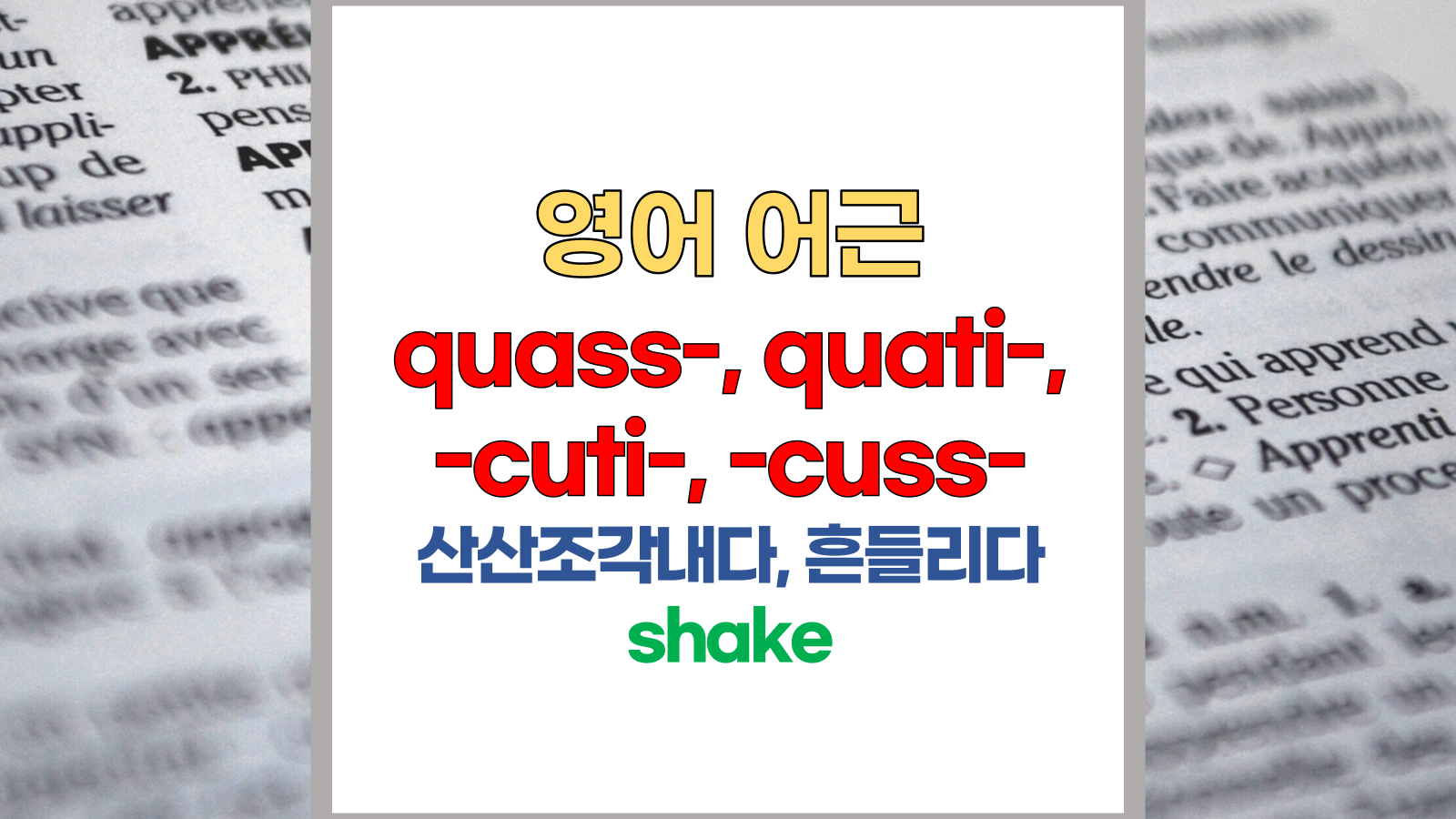 | 영어 어근 quati-, -cuti-, quass-, -cuss-는 라틴어(Latin) quatere, quassare, cassare, cassus, quassus에서 유래했습니다. 흔들리다, shake라는 기본적인 의미를 갖고 있습니다. |