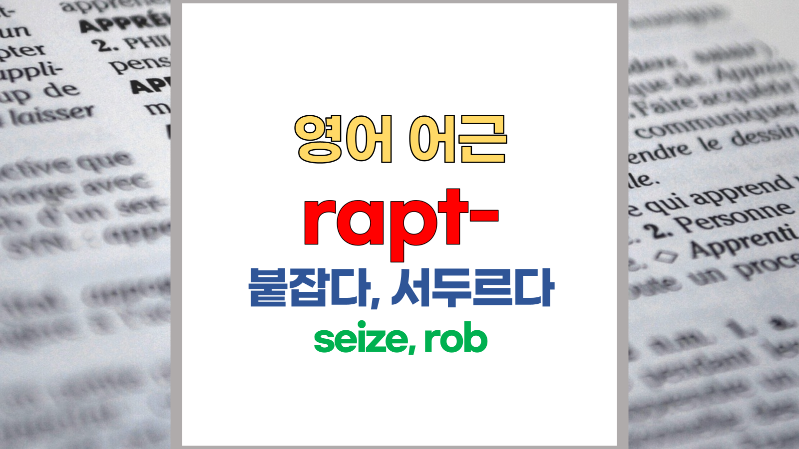 | 영어 어근 rapt-, rap-는 라틴어(Latin) rapere, raptus, rapidus에서 유래했습니다. 붙잡다, 서두르다, seize, eize, rob라는 기본적인 의미를 갖고 있습니다. |