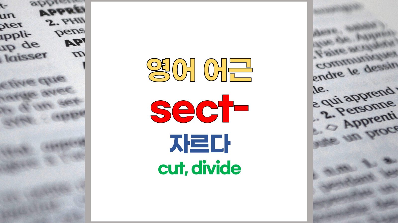 | 영어 어근 sect는 라틴어(Latin) secare에서 유래했습니다. 자르다, cut, divide라는 기본적인 의미를 갖고 있습니다. |