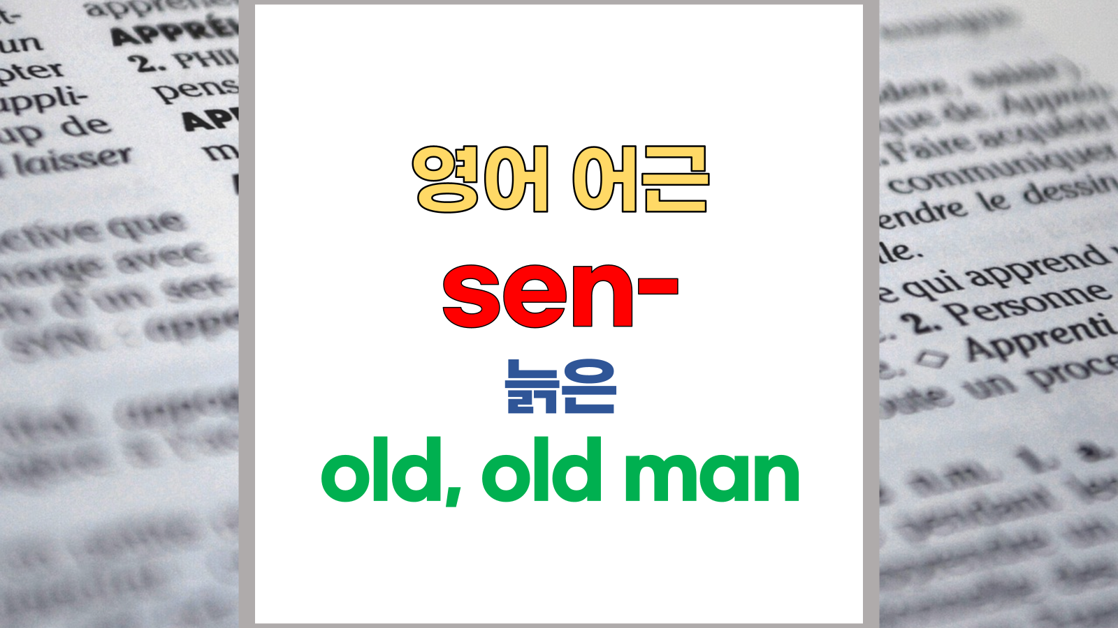 | 영어 어근 sen-은 라틴어(Latin) senex, senis에서 유래했습니다. 늙은, old, old man이라는 기본적인 의미를 갖고 있습니다. |