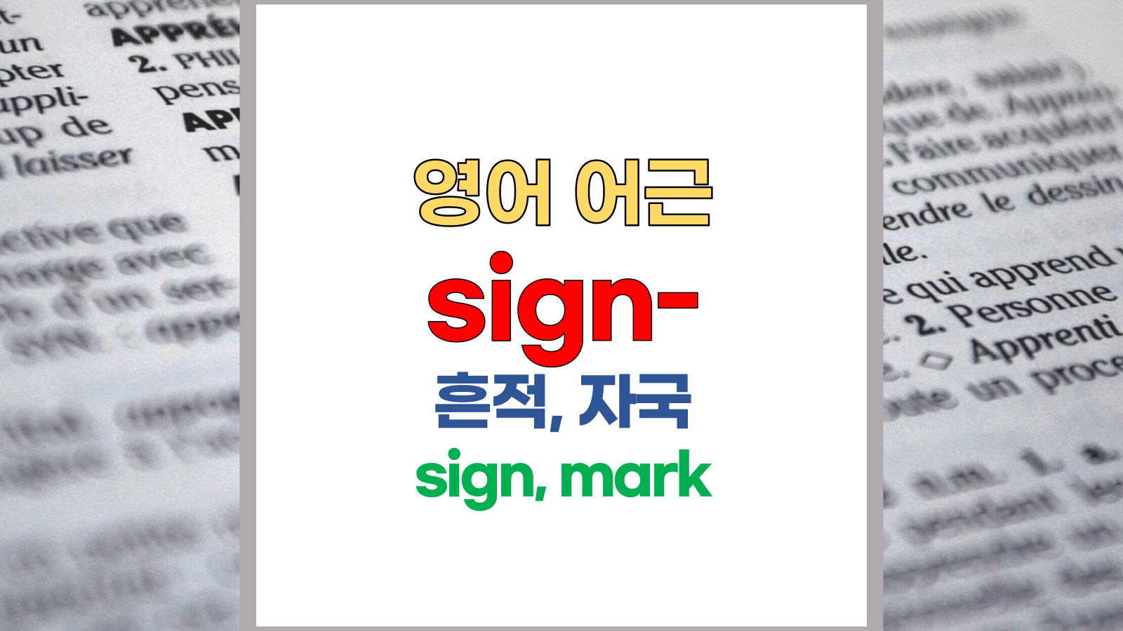 | 영어 어근 sign은 라틴어(Latin) signare, signum, sigillum에서 유래했습니다. 흔적, 자국, sign, mark이라는 기본적인 의미를 갖고 있습니다. |