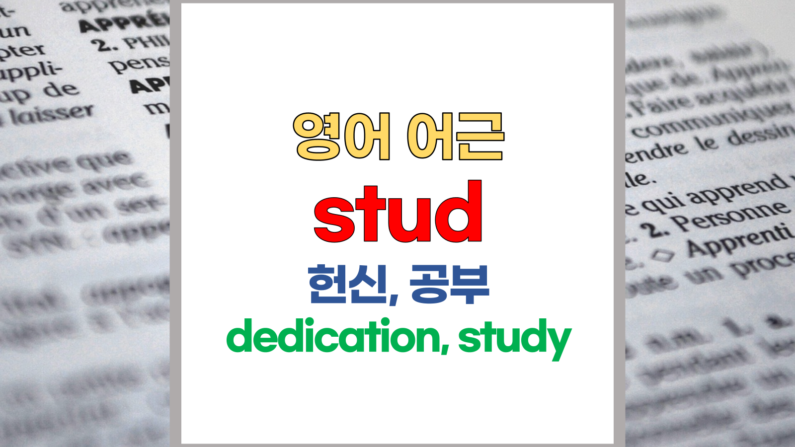 | 영어 어근 stud는 라틴어(Latin) studere, studium에서 유래했습니다. 헌신, 공부, diligent, dedication, study라는 기본적인 의미를 갖고 있습니다. |