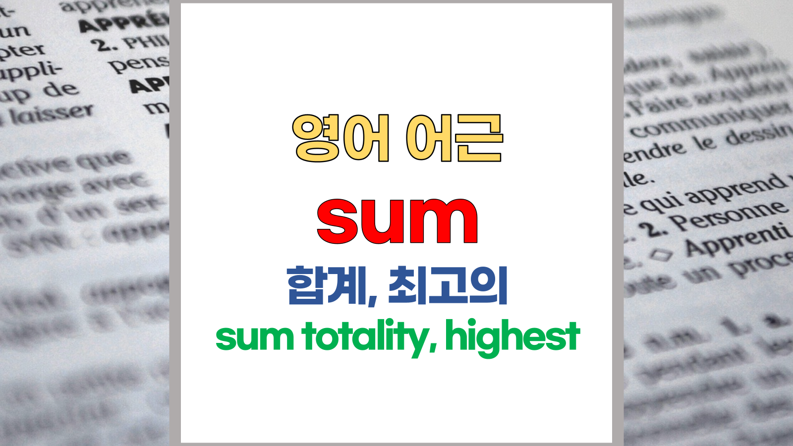 | 영어 어근 sum은 라틴어(Latin) summare, summa, summus, summum에서 유래했습니다. 합계, 최고의, sum, sum totality, highest이라는 기본적인 의미를 갖고 있습니다. |
