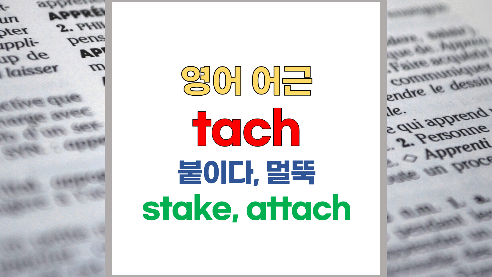 | 영어 어근 tach, stake는 고대 영어(Old English) tach에서 유래했습니다. 붙이다, 멀뚝, attach, stake, nail이라는 기본적인 의미를 갖고 있습니다. |