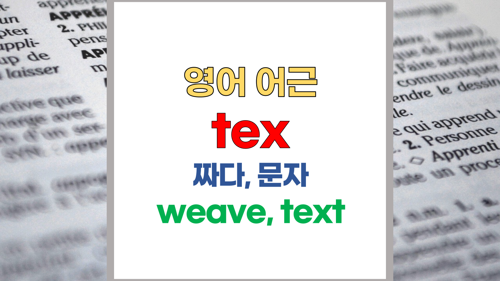 | 영어 어근 tex는 라틴어(Latin) texere, textus에서 유래했습니다. 짜다, 문자, weave, text라는 기본적인 의미를 갖고 있습니다. |