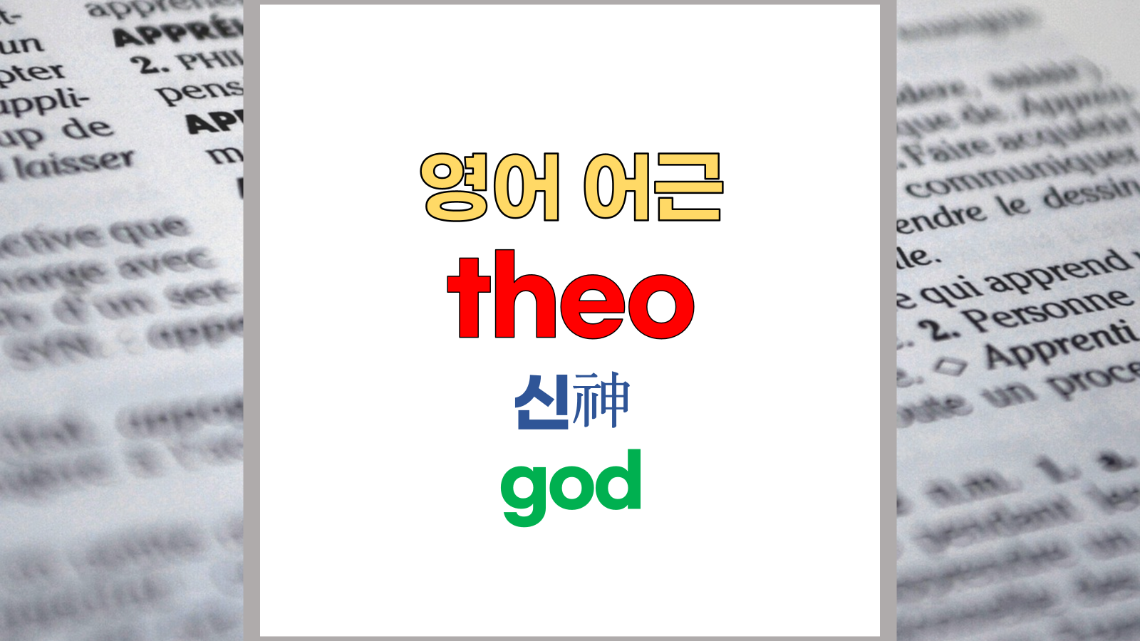 | 영어 어근 theo는 그리스어(Greek) theos에서 유래했습니다. 신(神), 신학, 관련한 축제 및 행사, 신내림, 황홀경, 엑스터시, 잔치, 야단법석, god라는 기본적인 의미를 갖고 있습니다. |
