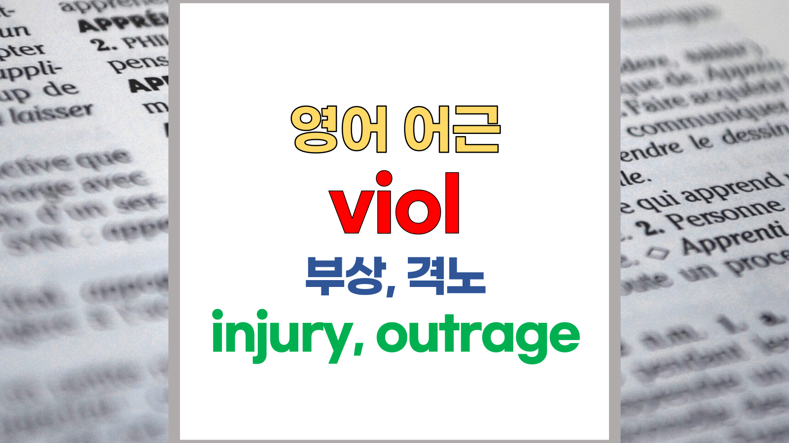 | 영어 어근 viol은 라틴어(Latin) violentus, violare에서 유래했습니다. 부상, 격노, injury, outrage, dishonor라는 기본적인 의미를 갖고 있습니다. |