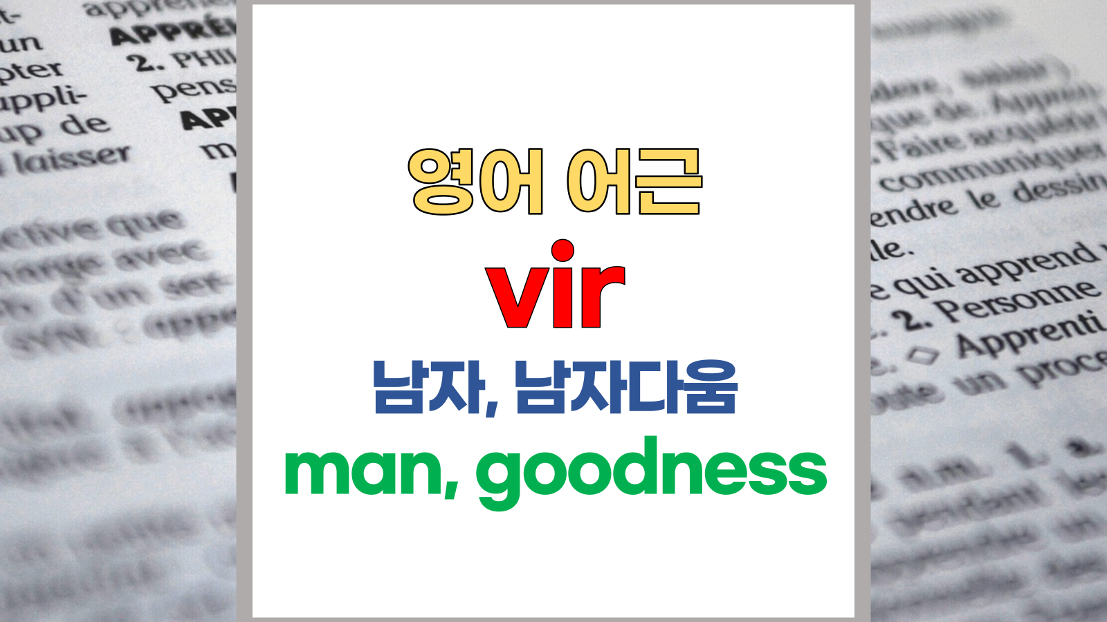 | 영어 어근 vir는 라틴어(Latin) vir, virtus에서 유래했습니다. 남자, 남자다움, man, goodness; manliness라는 기본적인 의미를 갖고 있습니다. |