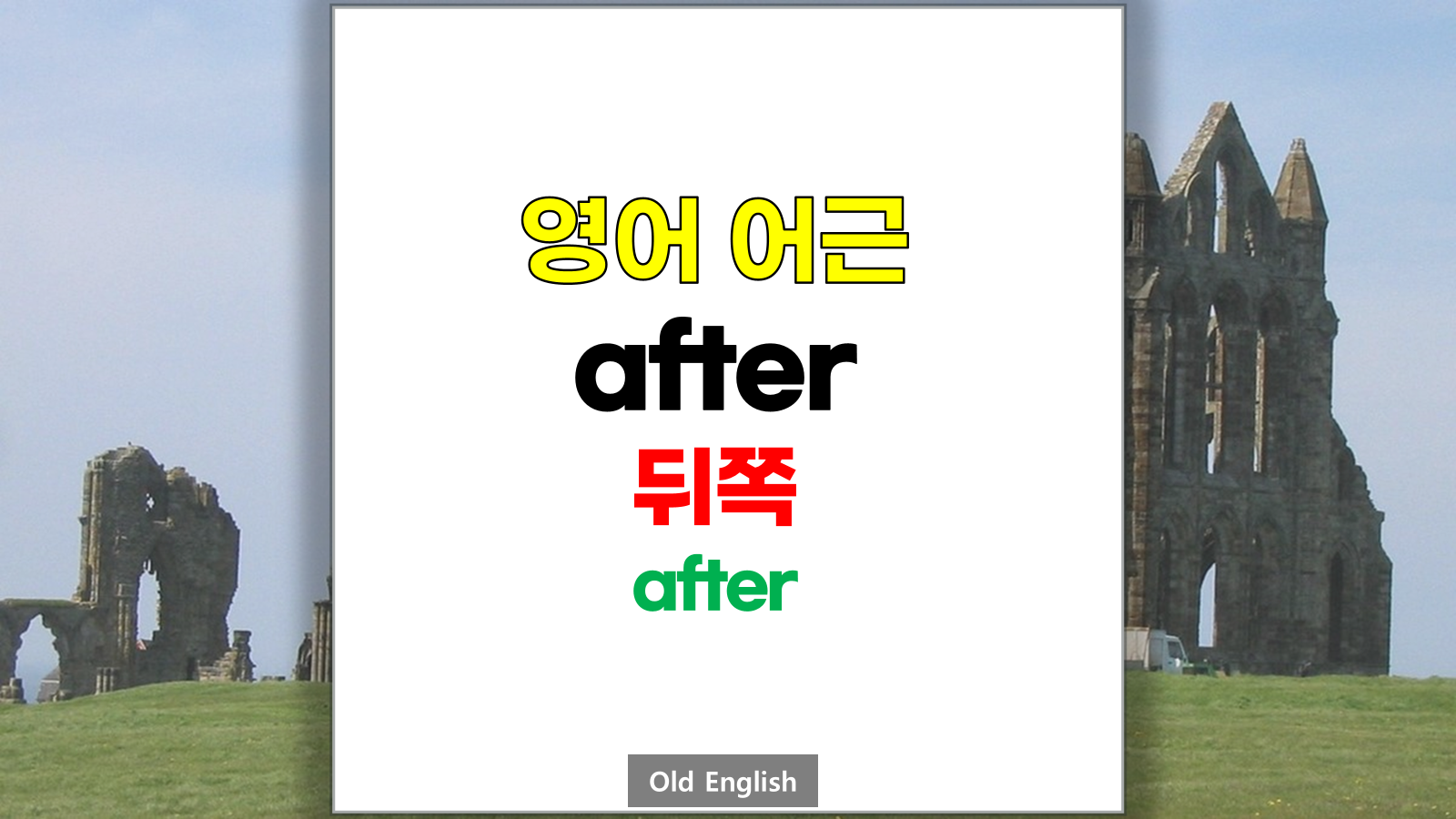 | 영어 어근 after는 고대 영어(Old English) æfter에서 유래했습니다. 뒤쪽, 뒤, 후, after라는 기본적인 의미를 갖고 있습니다. |