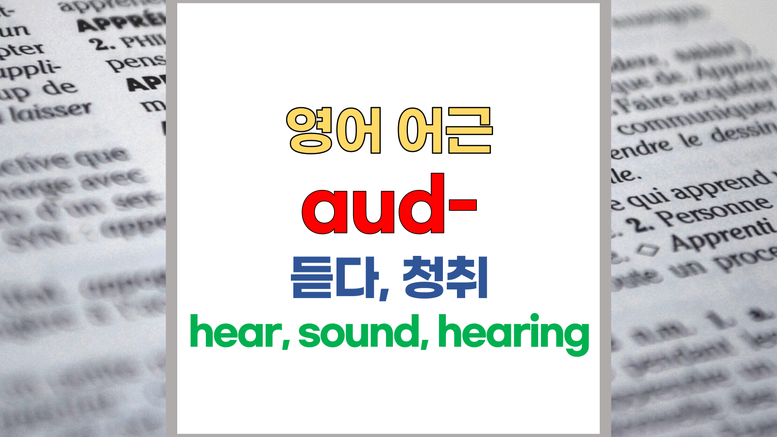 | 영어 어근 aud-, audi-, audio-는 라틴어(Latin) auditus, audire에서 유래했습니다. 듣다, 청취, hear, sound, hearing, listening이라는 기본적인 의미를 갖고 있습니다. |