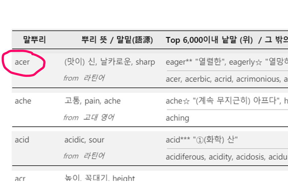 ‘뿌리 뜻’이란 이 어근이 갖고 있는 기본적인 의미를 말합니다. acer- 어근의 기본 뜻은 ‘(맛이)신, 날카로운’이란 뜻입니다.