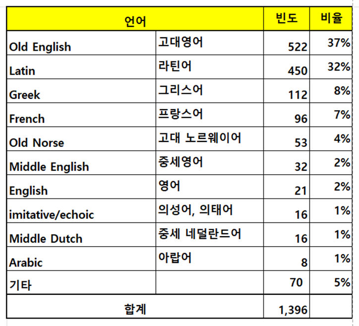 이 자료에서 old English는 대체로 앵글로 색슨족이 쓰던 언어를 말합니다. 여기에 고대 노르웨이어(Old Norse), 중세영어, 영어 등으로 분류된 것이 앵글로색슨 계열 언어입니다. 이들 계열의 언어가 46% 정도입니다. 그리고 라틴어, 그리스어, 프랑스어로 분류된 것이 라틴어 계열입니다. 이들 단어의 비중이 47% 입니다.