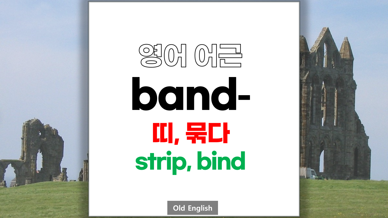 | 영어 어근 band는 고대 영어(Old English) bend에서 유래했습니다. 띠, 묶다, strip, bind라는 기본적인 의미를 갖고 있습니다. |