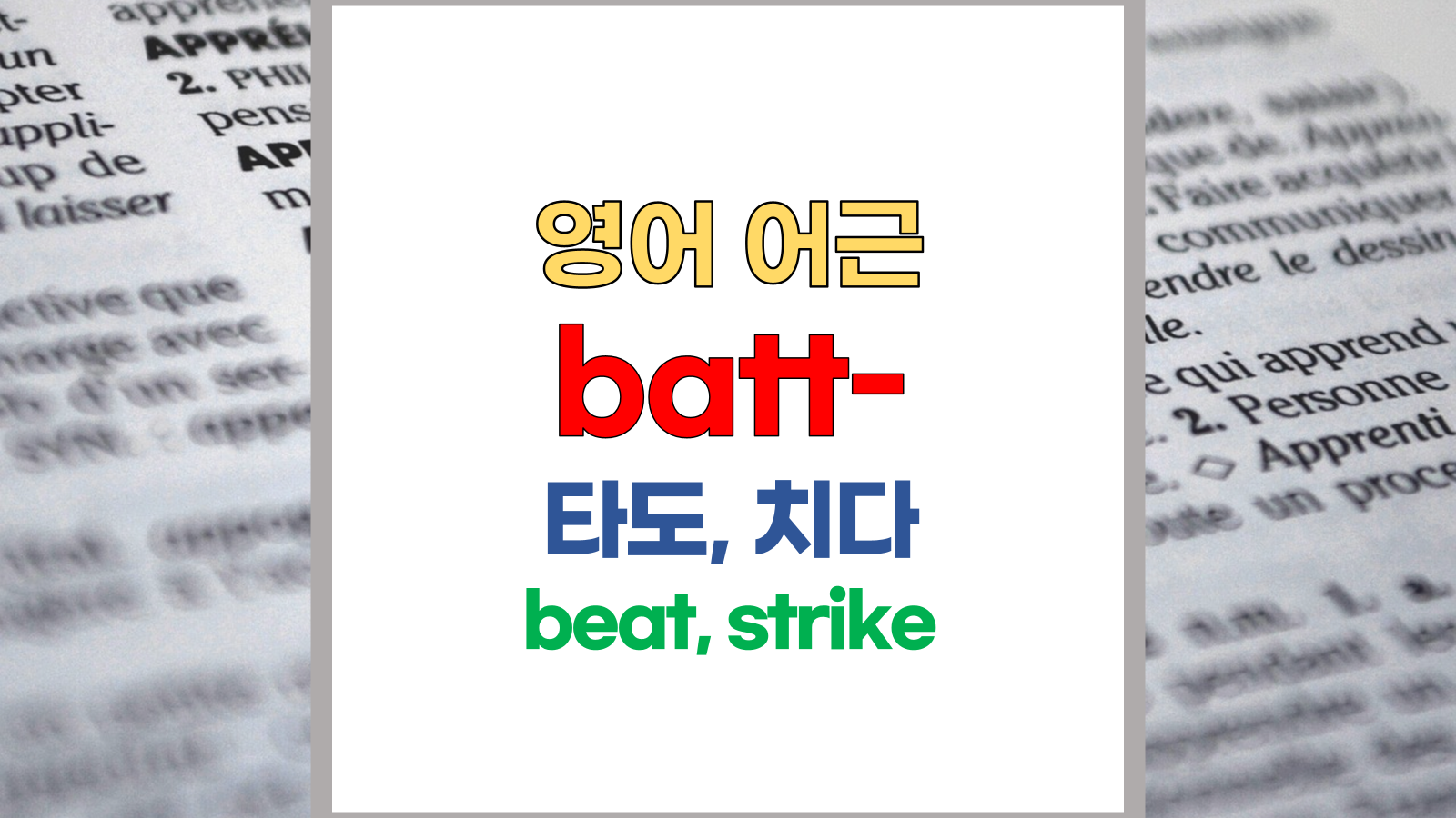 | 영어 어근 batt-, bat-는 라틴어(Latin) battalia, batuere, battuere, batre에서 유래했습니다. 타도, 타도하다, 치다, beat, strike라는 기본적인 의미를 갖고 있습니다. |