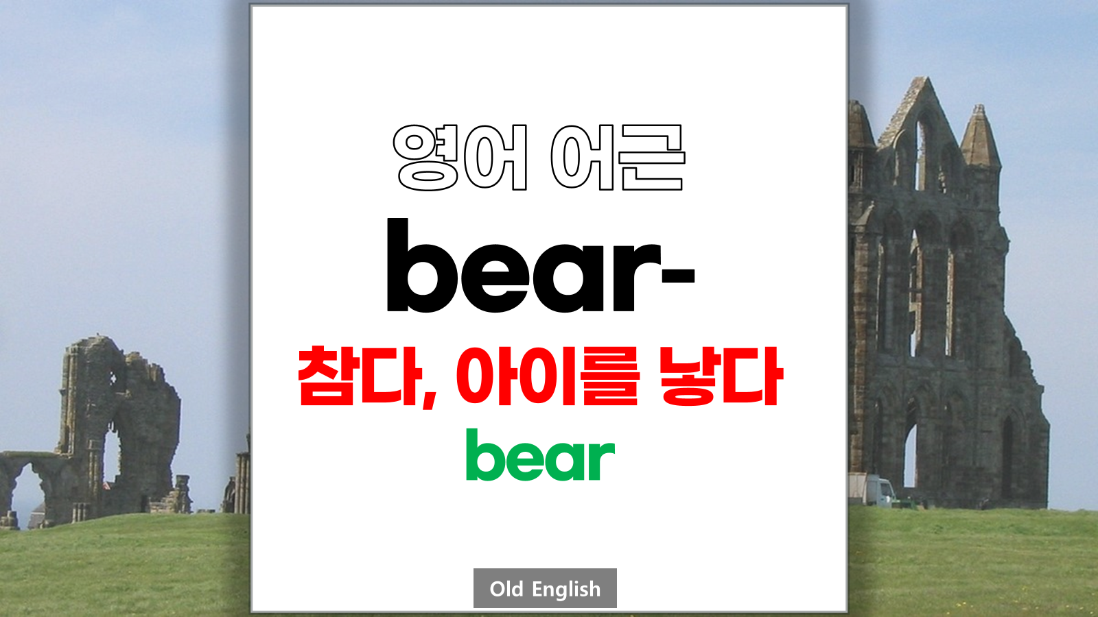 | 영어 어근 bear는 고대 영어(Old English) beran, bær, boren, byrde, gebyrde에서 유래했습니다. 참다, bear라는 기본적인 의미를 갖고 있습니다. |