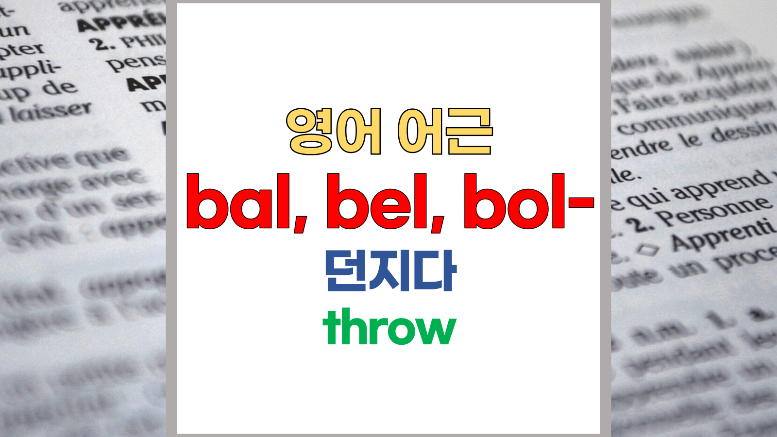 | 영어 어근 bal-, bel-, bol-은 그리스어(Greek) bole, blema, ballein에서 유래했습니다. 던지다, throw라는 기본적인 의미를 갖고 있습니다. |
