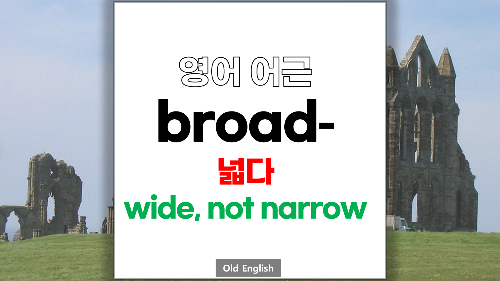 | 영어 어근 broad는 고대 영어(Old English) brad에서 유래했습니다. 넓다, wide, not narrow라는 기본적인 의미를 갖고 있습니다. |