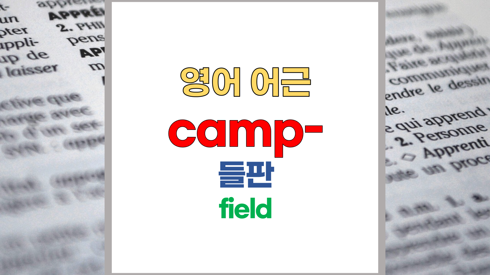 | 영어 어근 camp는 라틴어(Latin) campus, campania에서 유래했습니다. 들판, field라는 기본적인 의미를 갖고 있습니다. |
