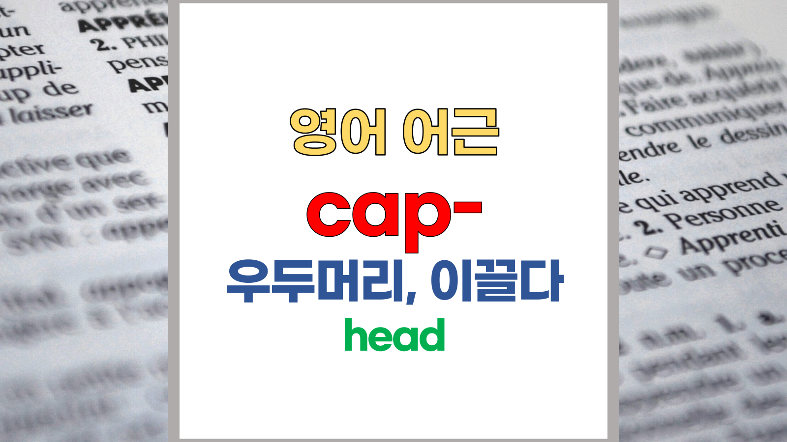 | 영어 어근 cap은 라틴어(Latin) caput, capitis, cappa에서 유래했습니다. 머리, 우두머리, 이끌다, head라는 기본적인 의미를 갖고 있습니다. |